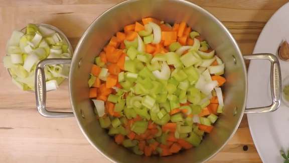 Chop the vegetables, starting with the onion. Slice the onion in half from the root to the tip and peel off the outer skin. Then, place the flat side down on the cutting board and slice horizontally from the tip to the root, leaving the root intact to hold the slices together. Slice across the onion in the other direction to dice the onion.
