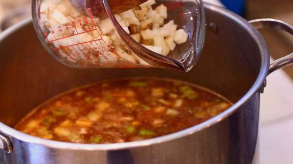 Place a large pot over medium high heat and add a splash of cooking oil. Add the onions. Once the onions have softened add in the celery, pepper, squash, sage and garlic and cook for about 3 – 5 minutes.