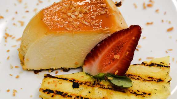 Place filled containers into a hot water bath and bake in the oven at 350°F for one hour. The flan should still have a very nice “jiggle” to it when it is done.