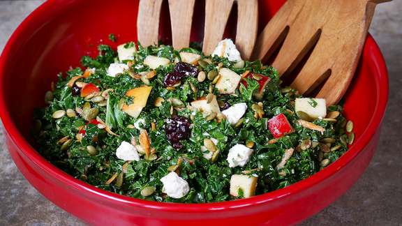 In a large bowl, combine shredded kale, carrot, apple, craisins, pumpkin seeds and feta.