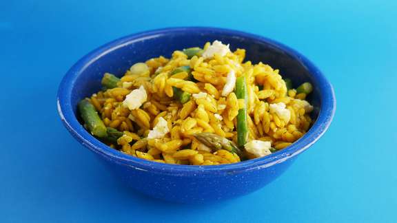 Place the hot orzo in a spacious, heat-resistant bowl and add the asparagus and green onions.