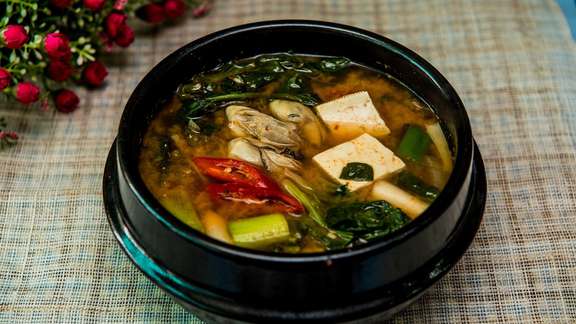 Add the green onions, tofu, bok choy, and chile flakes. Let the soup simmer gently for 8 minutes. Taste and adjust seasoning with salt or miso as needed.
