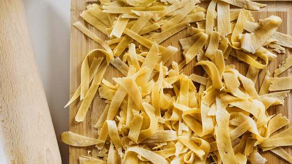 Roll the dough through a pasta machine until it is the thickness of a business card (Setting 5 or 6). Dust the sheets heavily with flour and fold them loosely into a flat, wide roll. Use a sharp knife to cut the roll into ribbons approximately 1 inch (2.5 cm) wide. Unfurl the ribbons immediately and toss them in a “nest” with more flour to prevent sticking.