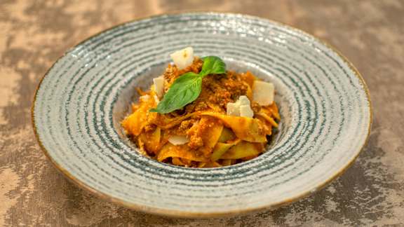 Papperdelle with Italian Sausage, Sundried Tomato Sugo, Pangrattato
