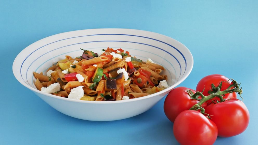 Combine cooked vegetables with cooked penne, and enough reserved pasta water to thin out the sauce. Top with crumbled goat cheese. Enjoy your delicious dinner!