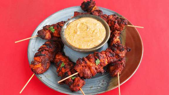 While the chicken is marinating, make the dipping sauce. Mix the yogurt, mint, and the remaining garlic, lemon juice, smoked paprika, and oil in a bowl and set aside.