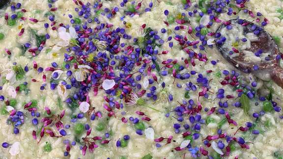 Add a couple ladles of the stock, enough to just cover the rice, and give the rice a stir. Simmer the rice in the stock until most of the liquid has been absorbed, then add another ladle. Repeat until all the stock has been added to the pan. Taste the rice, and if it is still crunchy add a ladle of water. Cook until the rice is al dente.