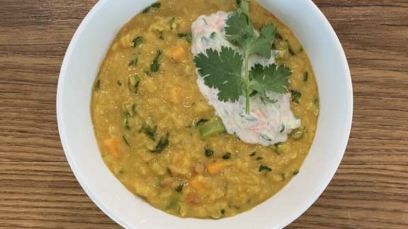Add lentils, tomato, coconut milk, and vegetables broth. Season gently with salt.
