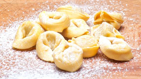 Place about ½ teaspoon of filling in the centre of the pasta square. To form a tortellini, enclose the pasta filling by folding the pasta in half to form a triangle, wetting the pasta slightly with water if needed. Fold the two triangle corners together and pinch well. Continue this process until all the pasta and filling is used up.