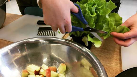 Dice the apples into bite sized pieces, quickly submerge them in cold water to keep them from discolouring.