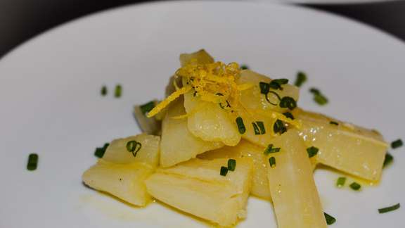 Remove the yuca from the oven and toss with the mojo (oil and garlic sauce). Plate and garnish with chopped chives.